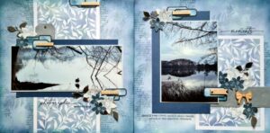 Bonjour, Après une petite pause, je vous présente une page bien fraîche. J’ai travaillé différentes teintes de Distress Oxide bleues et apporté de la lumière de différentes manières. Je vous