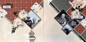 Bonjour, Le mois de novembre se termine et voici la double page que j’ai proposée en atelier ce mois-ci. J’avais envie de jouer avec des carrés posés sur la pointe