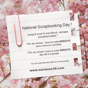 Bonjour, À l’occasion des French Days et du National Scrapbooking Day, profitez de belles remises sur tout le site (sauf rayons Nouveautés et Bonnes Affaires) jusqu’à lundi minuit : 10%