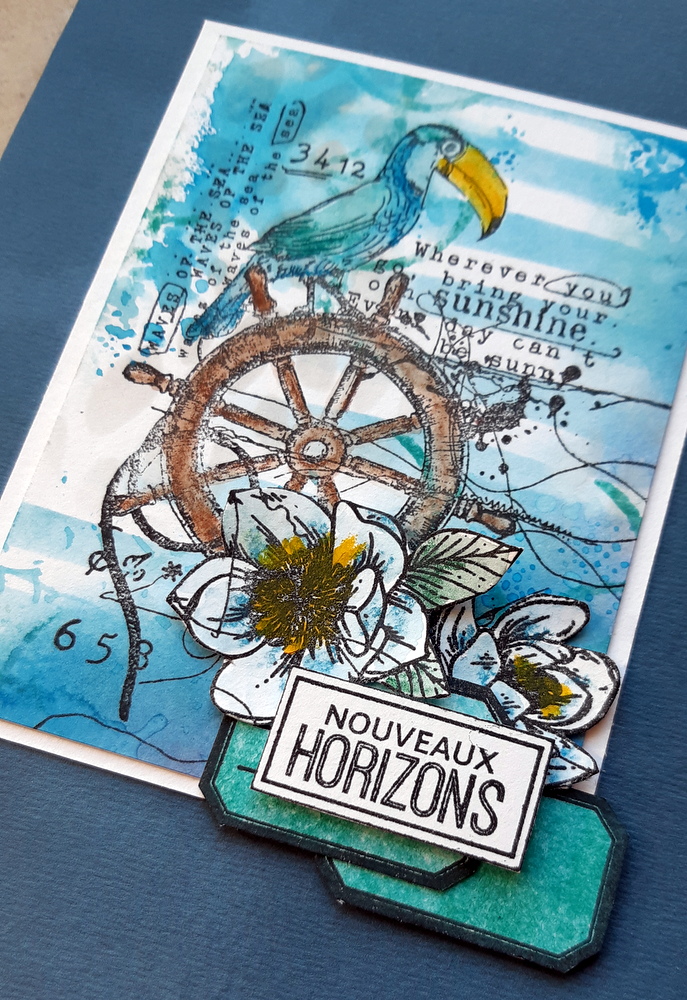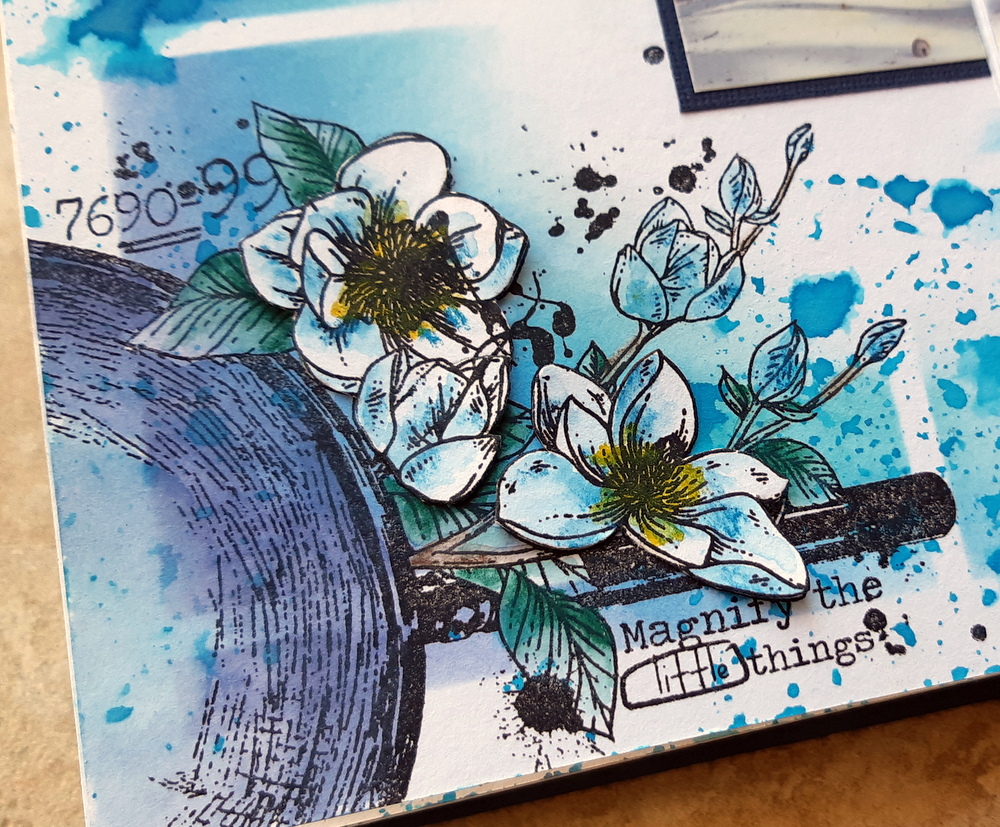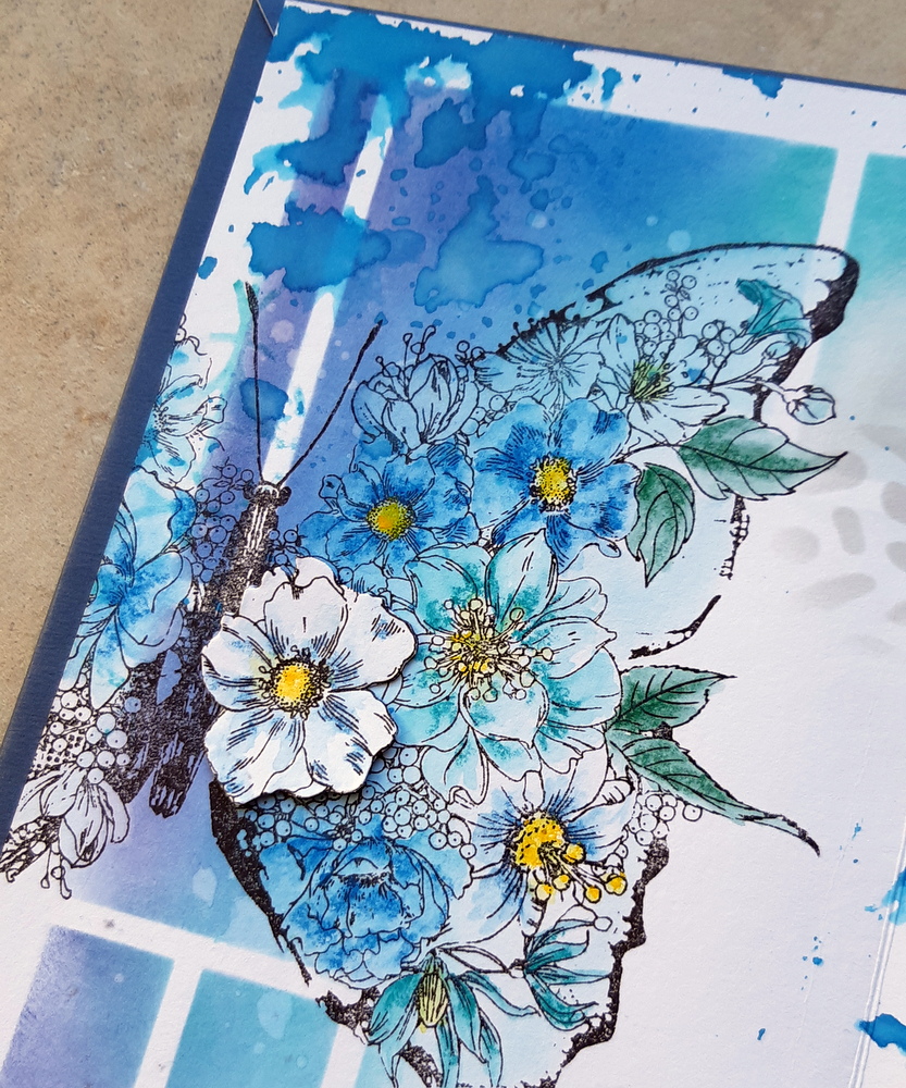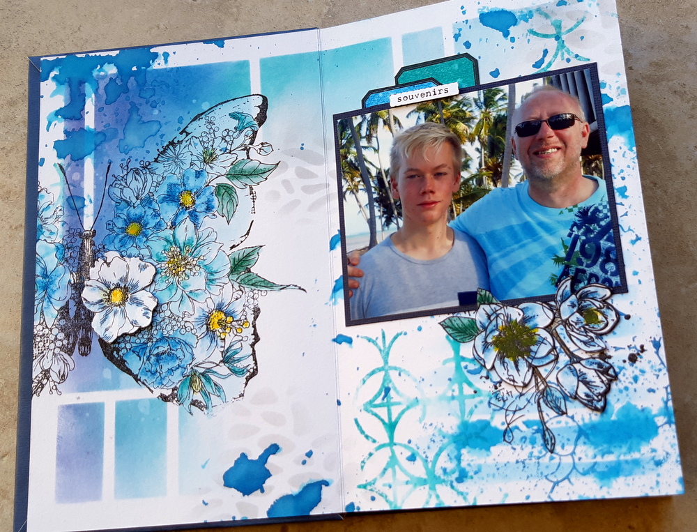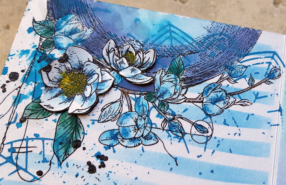 Un peu de patouille avec des encres Distress Oxide et des crayons aquarellables, et voici un petit aperçu du résultat :