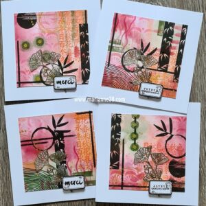 Bonjour, Aujourd’hui, je vous partage cette série de cartes réalisées avec la collection Chou & Flowers Soleil Levant, dans un style différent de la double page que je vous ai
