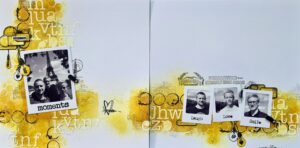 Bonjour ! Voici la double page que j’ai proposée en atelier ce mois-ci. J’avais envie de couleur et d’un peu de patouille avec de la pâte de texture. La première