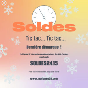 Bonjour, Plus que quelques jours pour profiter des soldes… et d’une dernière démarque ! Dès à présent, avec le code SOLDES2415, bénéficiez de 15 % de remise supplémentaires sur tous
