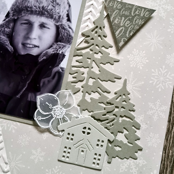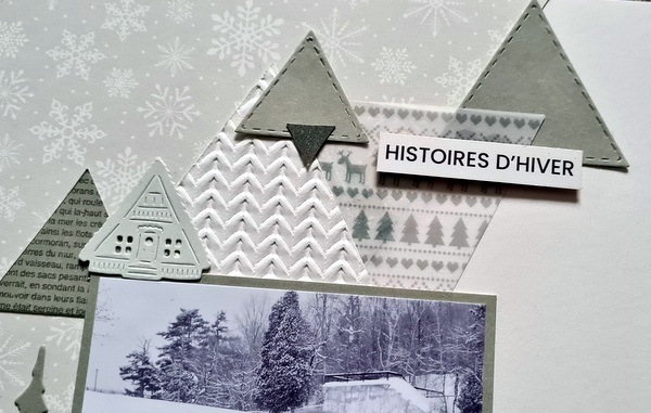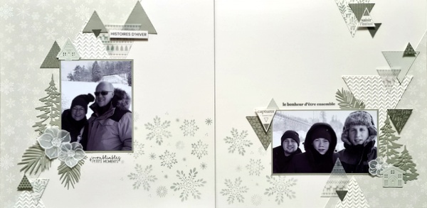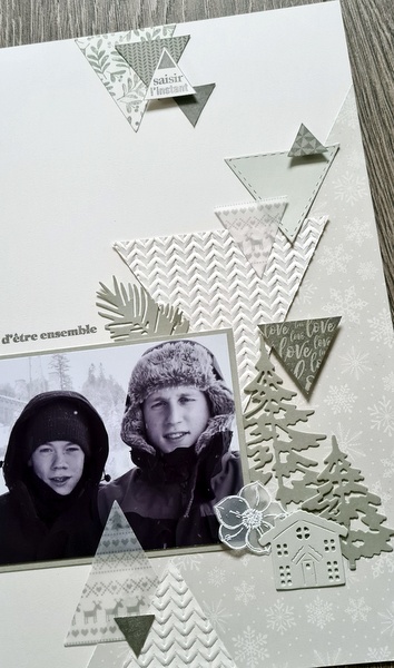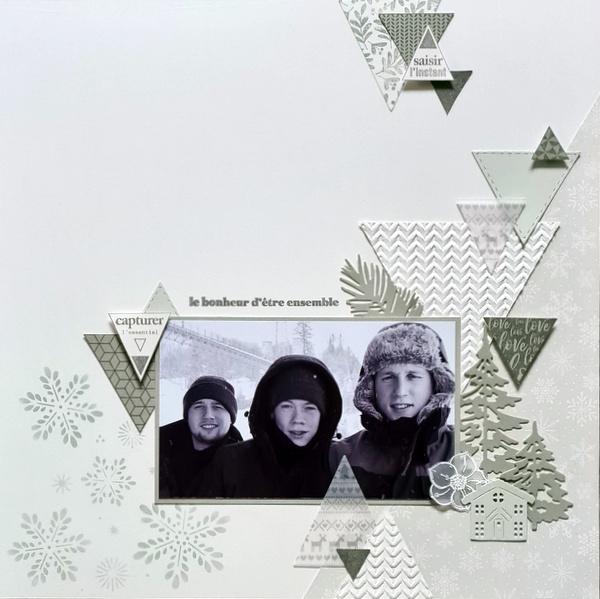 J’avais envie de jouer avec des formes géométriques sur une page tout en douceur, alors j’ai opté pour un joli papier de la collection Florilèges Design Histoires d’hiver, et un papier uni duo Verveine assorti.