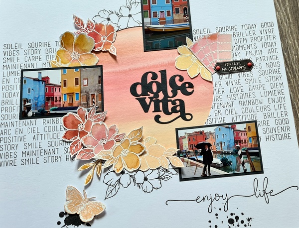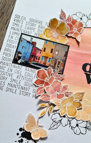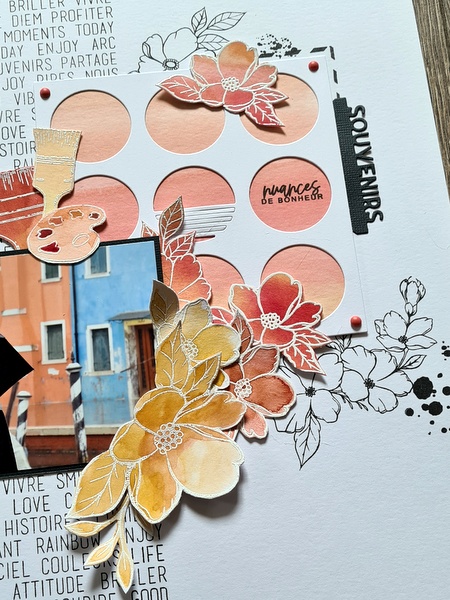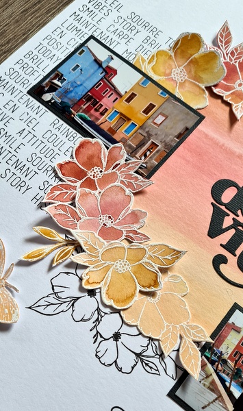 Les fleurs et les autres éléments collés sur les pages ont été embossés avec de la poudre d’embossage blanche.