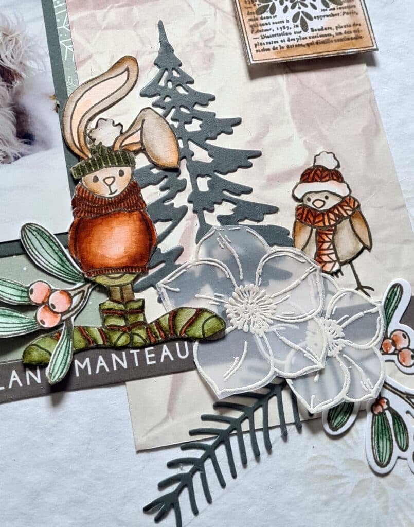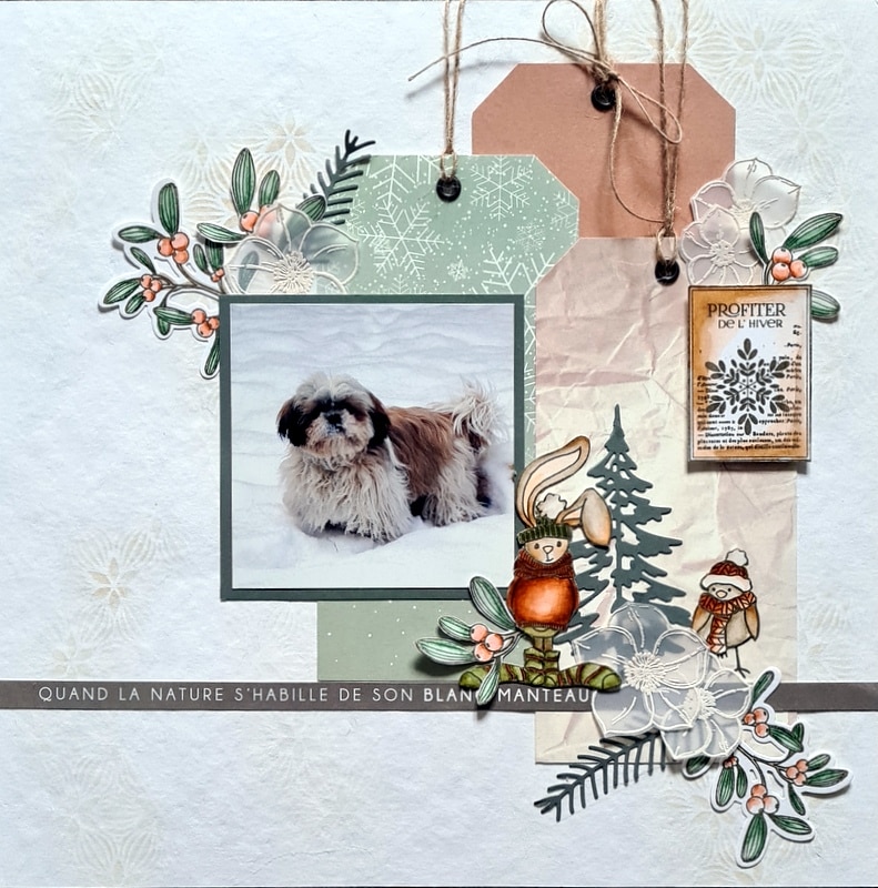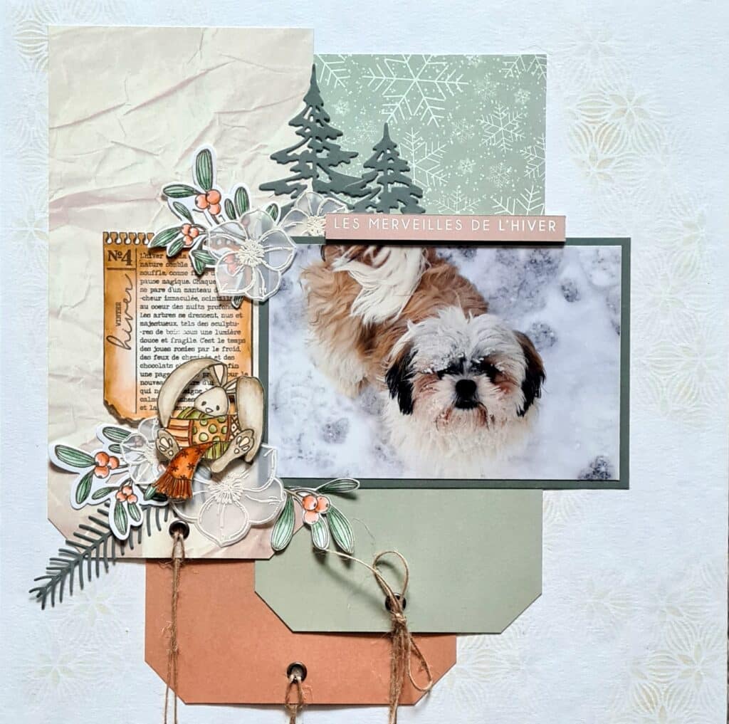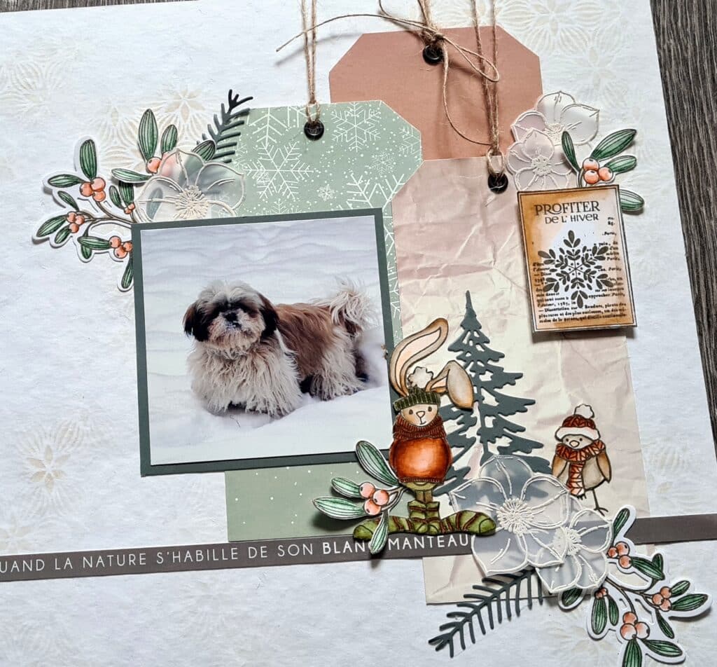 Une page hivernale tout en douceur, avec les jolis tampons Longues Oreilles et un pochoir de L’Encre & l’Image.