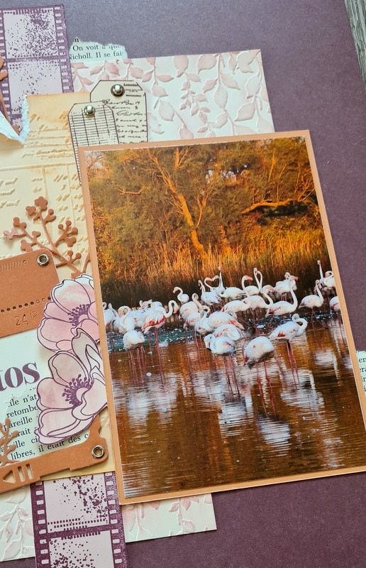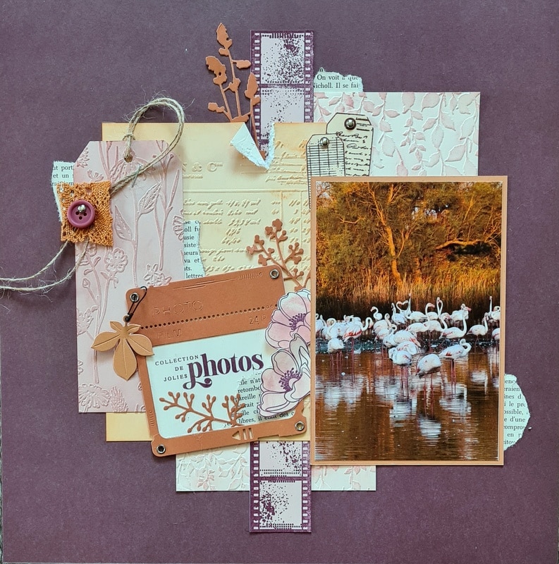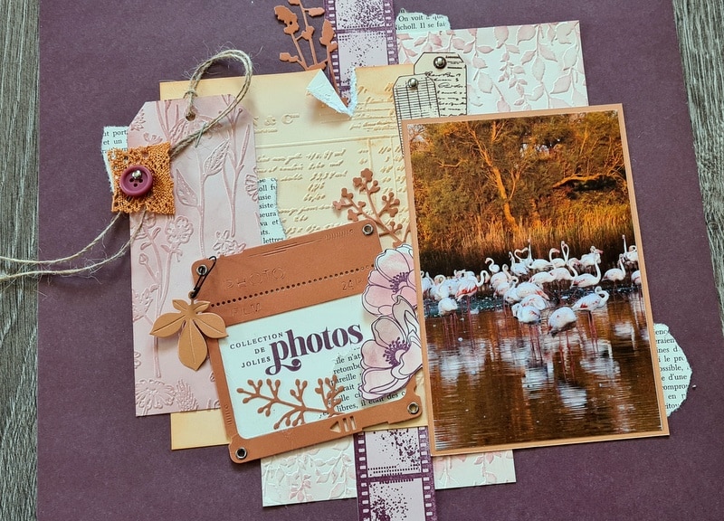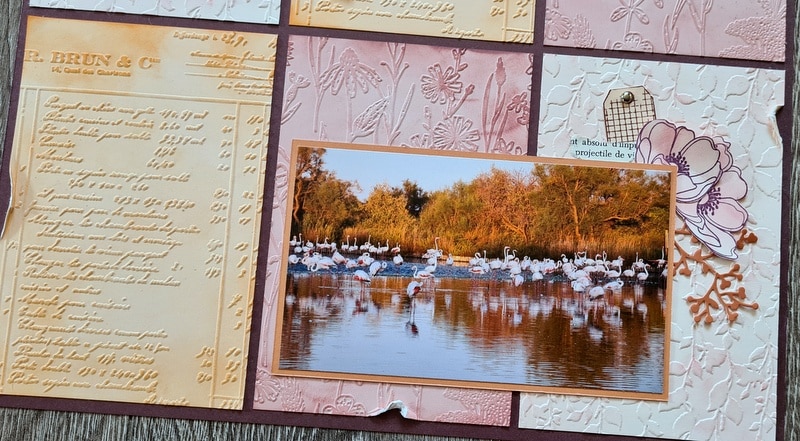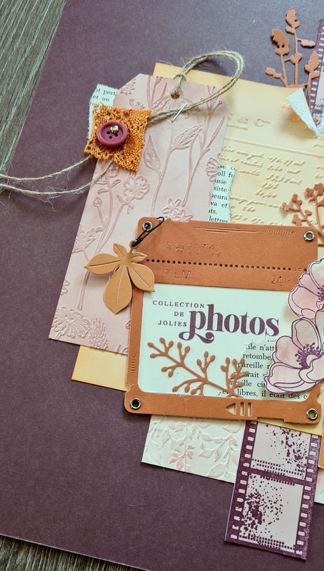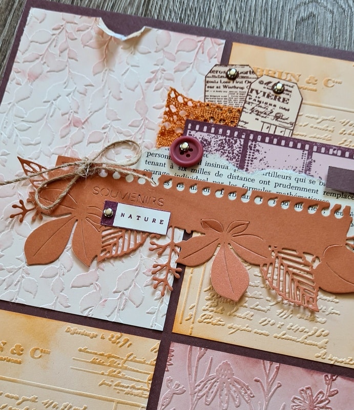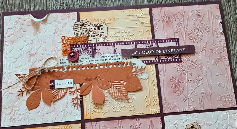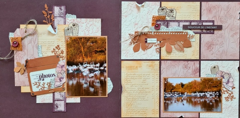 Une double page automnale, dans laquelle j’ai joué avec les classeurs d’embossage des collections Florilèges Design Carnet Nature et La Vie en Rose.