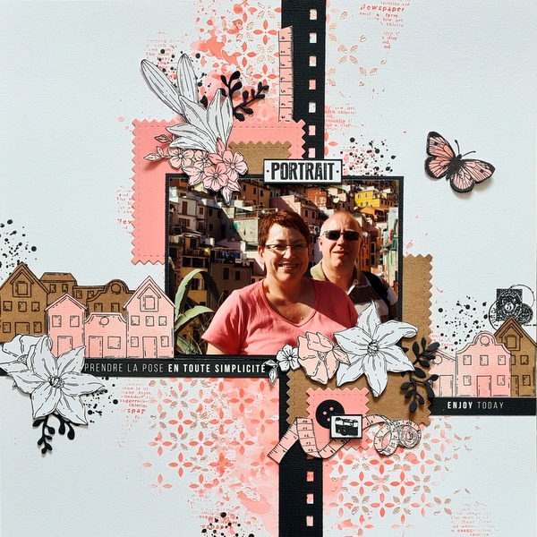 Sur mes fonds de page, j’ai utilisé un des nouveaux pochoirs Duo Colour de Craft Emotions. Ces pochoirs sont composés de 2 motifs complémentaires, que l’on peut utiliser avec des matériaux différents pour créer un motif bicolore (ou bi-matière). Ici, j’ai utilisé de l’encre Distress Oxide pour le premier motif, et de la pâte de texture Nuvo Glacier Paste pour le deuxième. J’aime beaucoup le rendu final. C’est la première fois que j’utilisais cette pâte de texture Nuvo. Elle est légère, mais suffisamment compacte pour ne pas glisser et baver sous le pochoir. Le résultat, une fois sec, est scintillant. J’adore !
