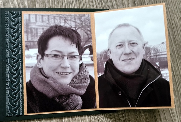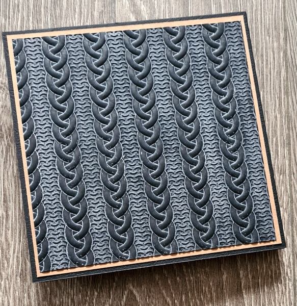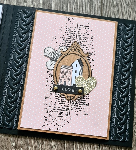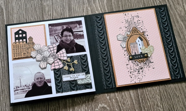 Pour la couverture, j’ai embossé du papier noir dans un classeur d’embossage préalablement encré à l’encre Distress Oxide Saltwater Taffy. Comme l’encre Oxide est opaque, elle fait ressortir le relief de l’embossage et fait un effet “craie” sur le papier, que j’aime beaucoup.
