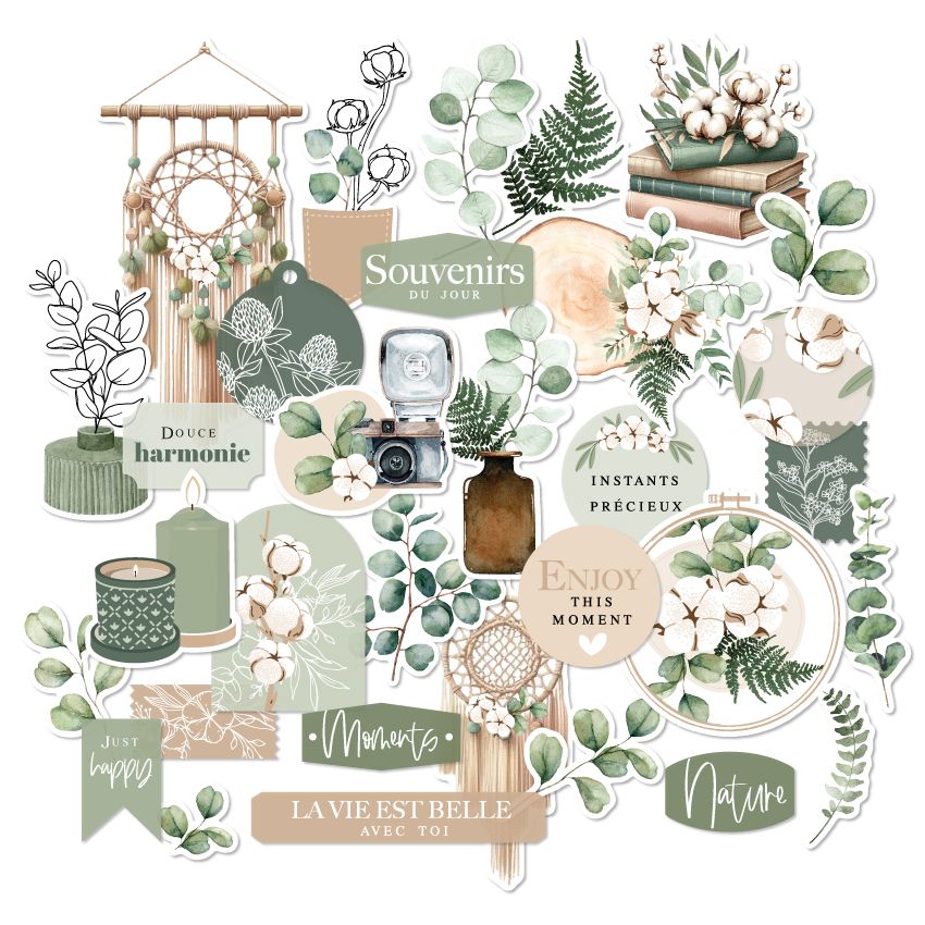 Ensemble de formes en papier imprimé découpé (die-cuts) de la marque Florilèges Design, collection HARMONIE.