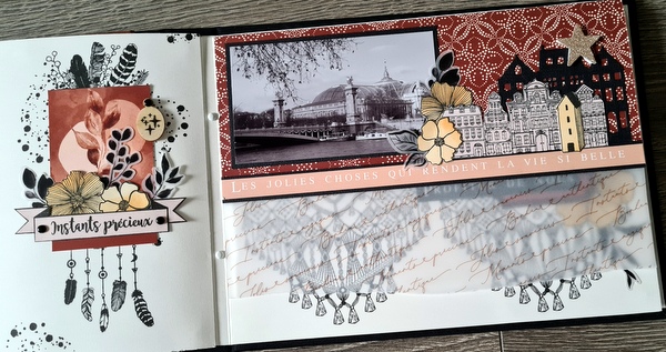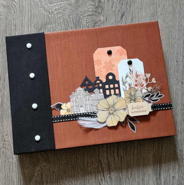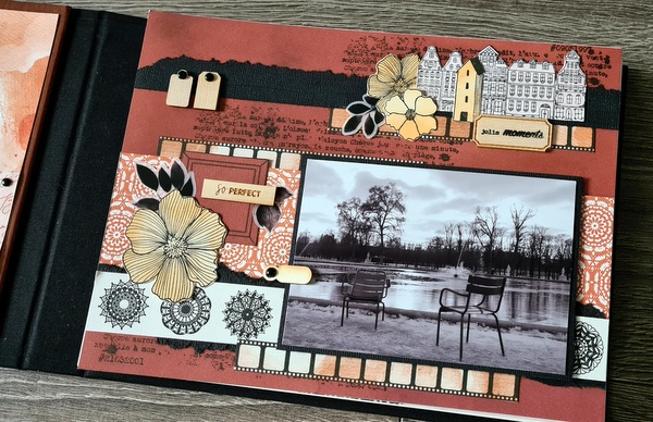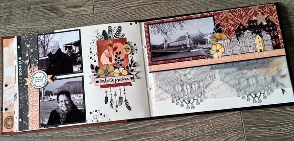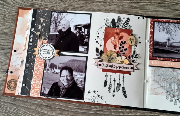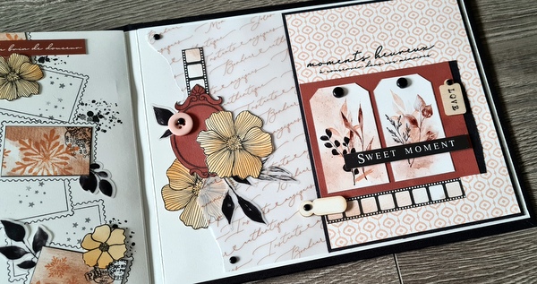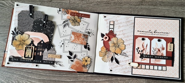 Réalisé avec des papiers Florilèges Design (collection Arizona), et des papiers unis assortis, dans un combo Noir, rouille, orange et blanc crème.