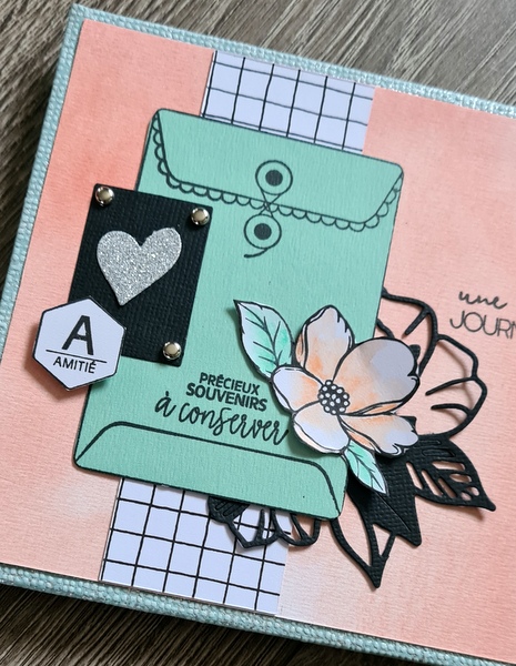Réalisé avec des papiers Florilèges Design (collection Dolce Vita), et des papiers unis assortis, dans un combo Noir, blanc, rose corail et vert opaline.