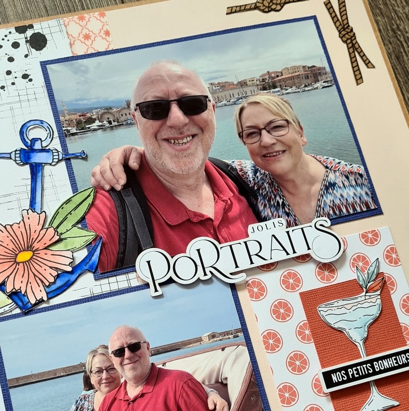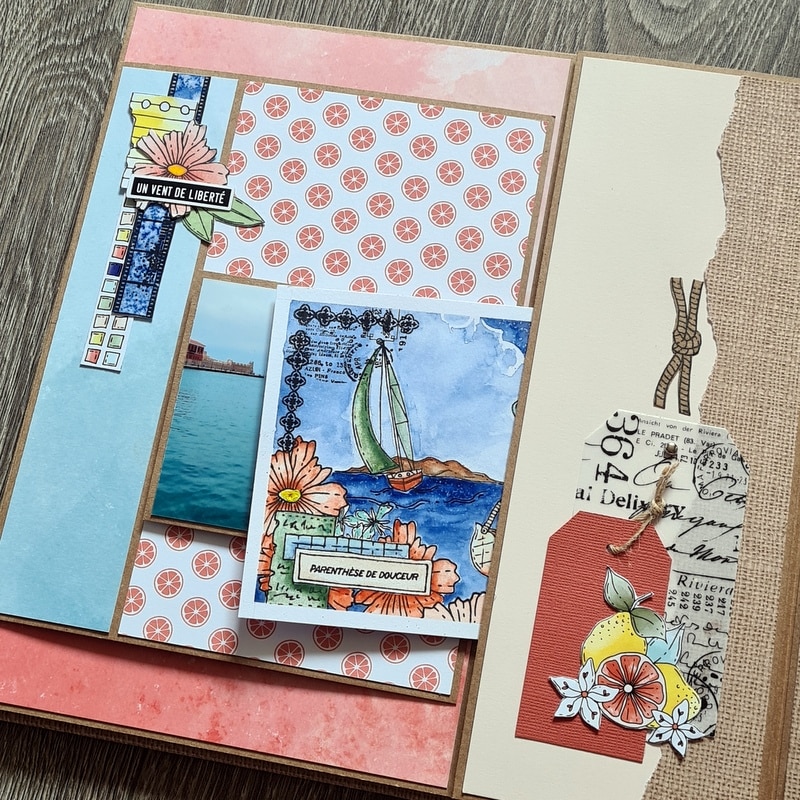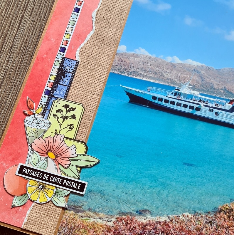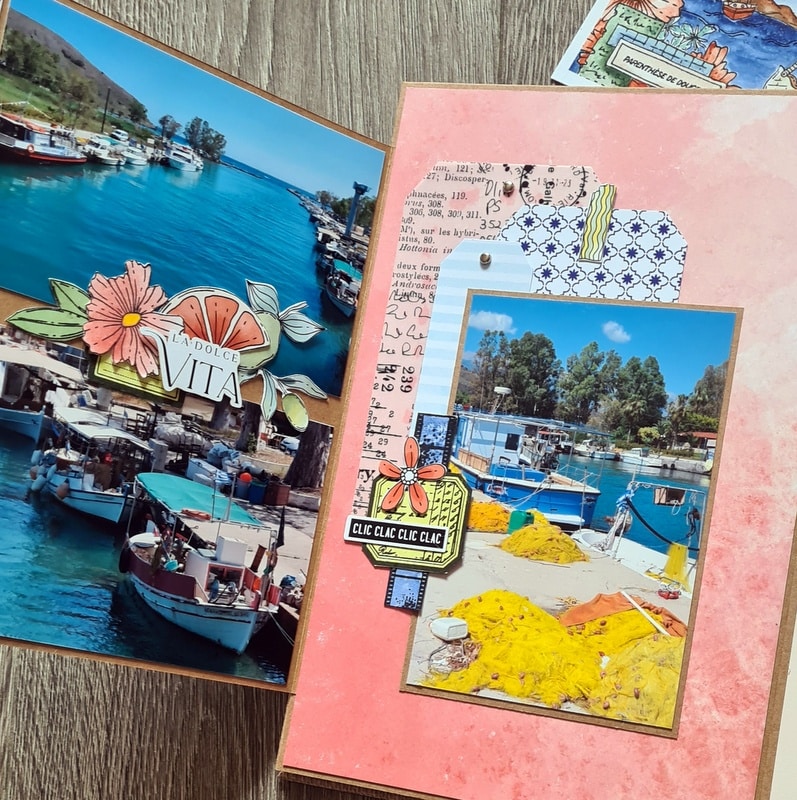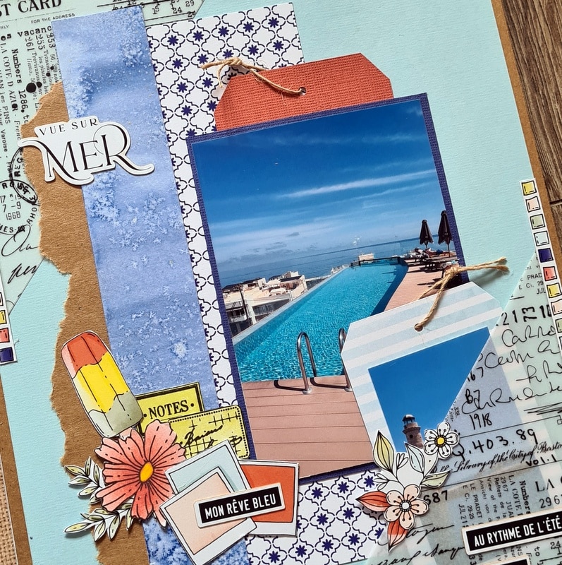 - Planche de tampons A4 Chou & Flowers Rêve Azur Le Hublot: inclus dans l’option Atelier + Kit complet. Tout l’album est réalisé en majorité avec cette planche de tampons.