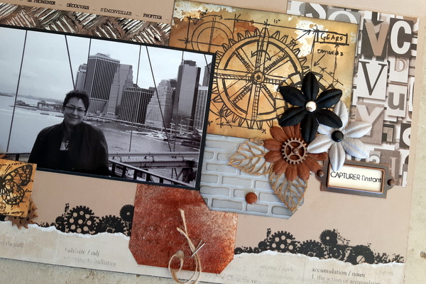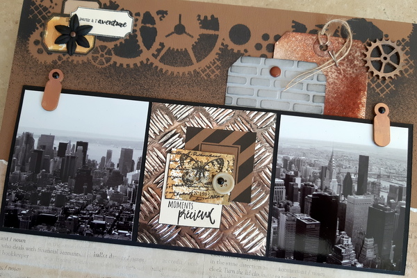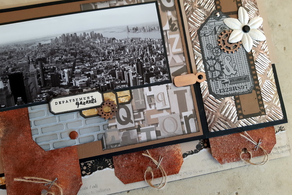 Côté technique, le programme est très généreux : tampons, utilisation de patines NUVO pour créer un effet cuivré, création de fausse rouille à l’aide d’encres Distress et poudre d’embossage,…