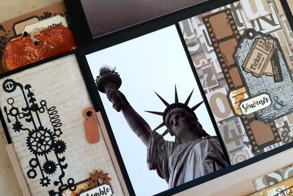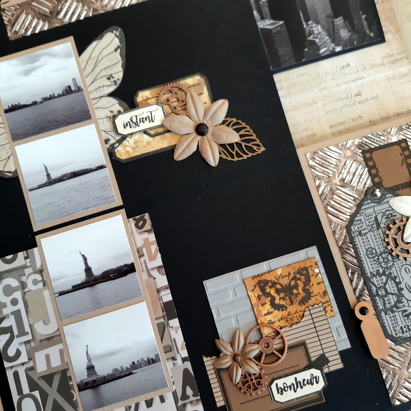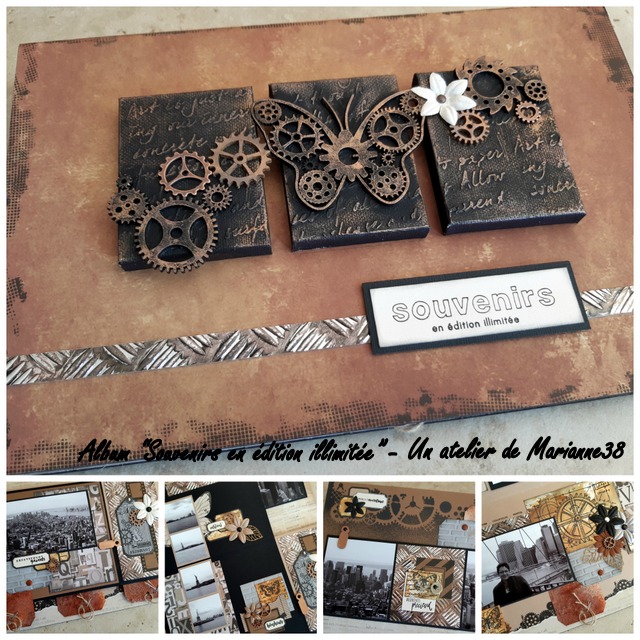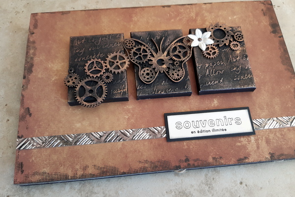 L’album Souvenirs en édition illimitée est un album très original et de belle taille (20 x 30.5 cm). La couverture, ornée de 3 petits châssis toilés travaillés façon Mixed Media, donne à l’ensemble une ambiance vintage industriel, tendance Steampunk, qui se prête à divers thèmes : voyage urbain, portraits (masculins ou pas), famille, etc.
