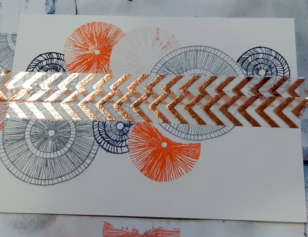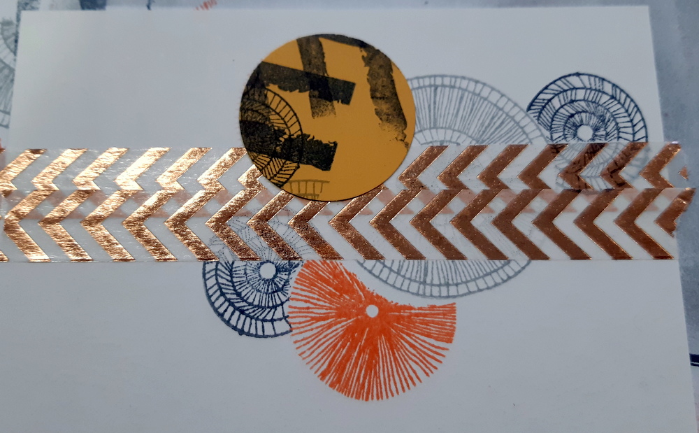 - Imprimez des motifs ronds de la planche de tampons “Bulles nippones” (Florilèges Design). Pour les faire se chevaucher, masquez le motif déjà imprimé à l’aide d’un cache de même dimension. Poursuivez vos impressions de manière à créer un motif sur toute la largeur de la carte.