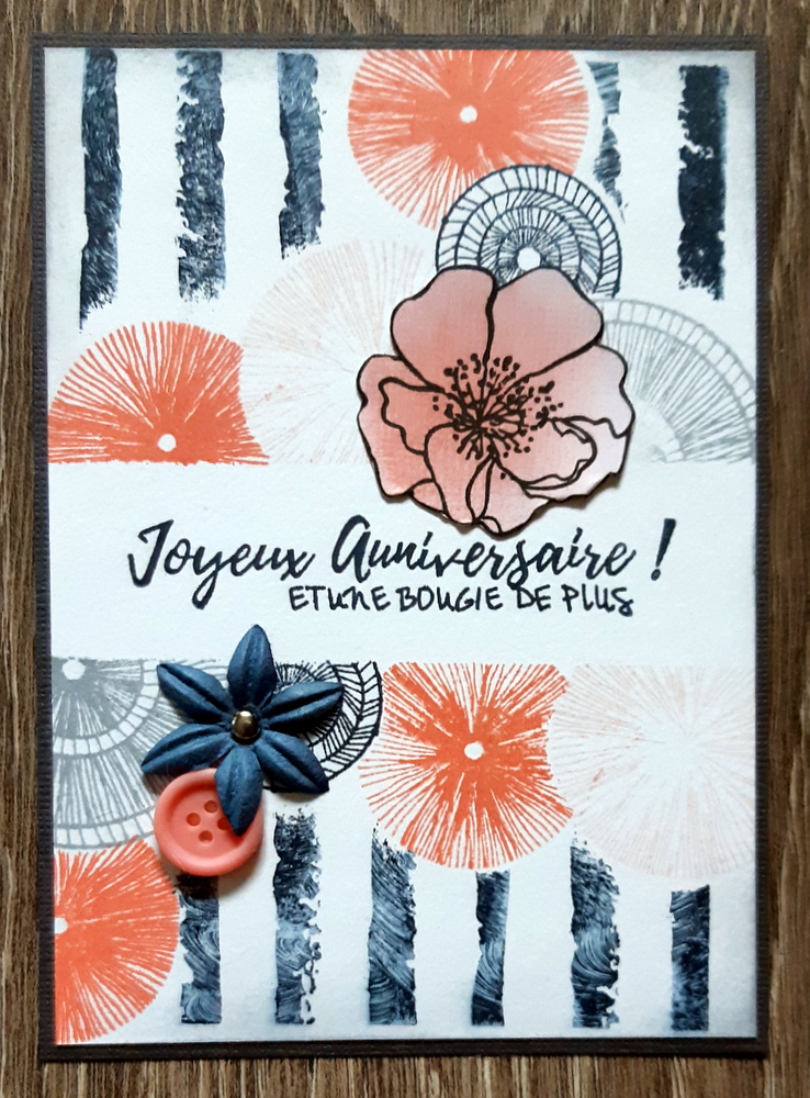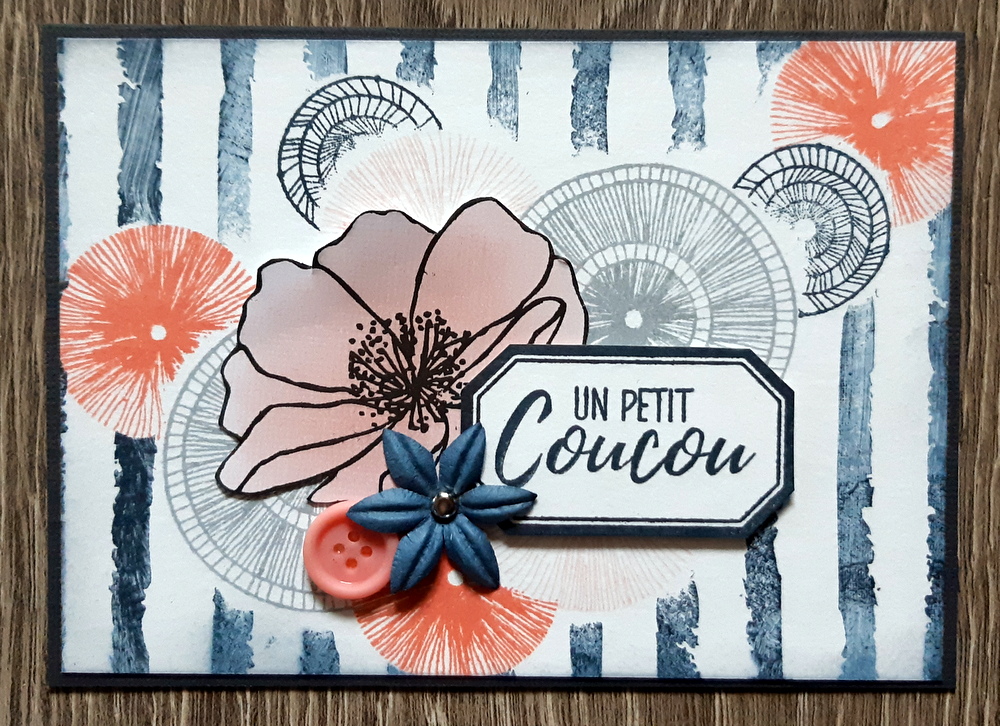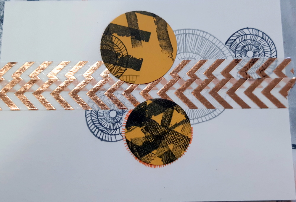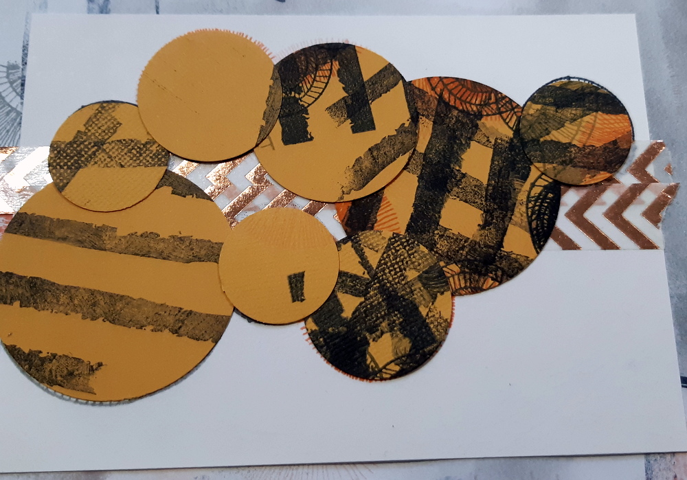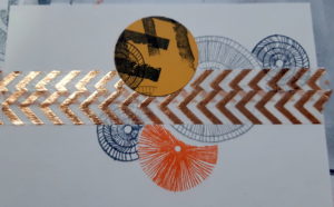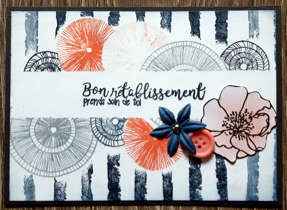 - A présent, recouvrez tous vos ronds à l’aide de caches, et imprimez le motif du tampon “Rayures grunge” (Florilèges Design). Imprimez le sentiment.