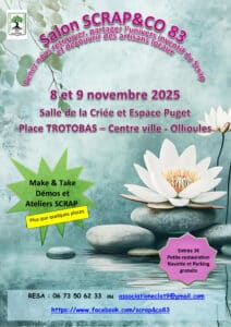 Un salon 100% scrapbooking ! Je serai présente avec ma boutique et proposerai des ateliers cartes Lavinia : Le samedi : la carte “maison et petites sorcières” Horaires : 10h15,