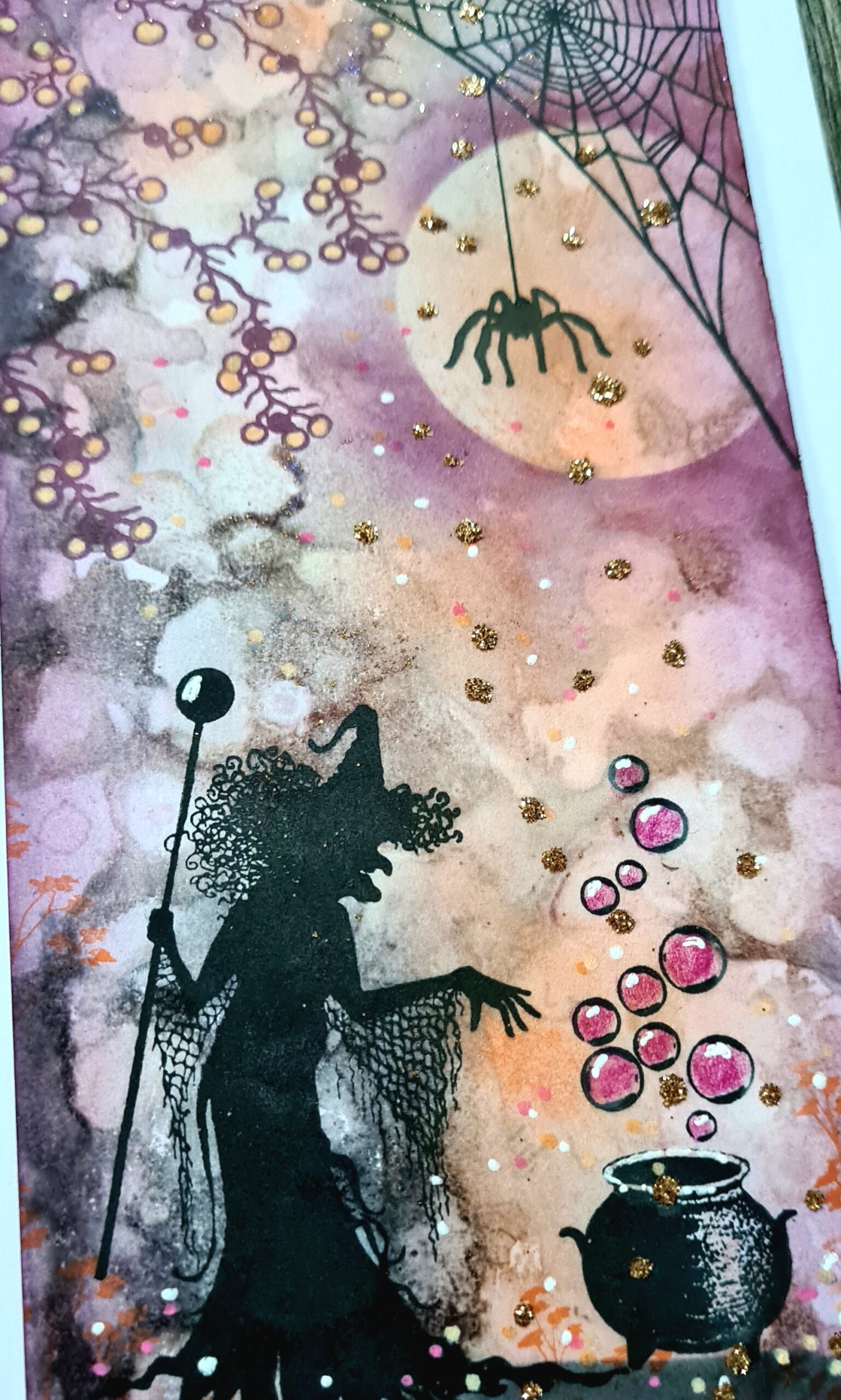 Pour terminer, j’ai imprimé les divers motifs de tampons Lavinia, colorisé les bulles au crayon, les petites baies au feutre Posca, et ajouté quelques paillettes;